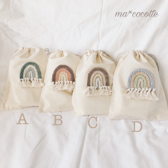 《ma*cocotteオリジナル・フリンジレインボー巾着袋》 ★こちらの商品はお支払い確認後に製作開始 致します。順番にお1つずつお作りする為、現在1週間から10日程度お日にちをいただきます。 ■サイズ:約タテ23cm ヨコ18cm ■A~Dのうちご希望のカラーを備考欄に 記載して下さい。 カラーは4パターンご用意しましたが、 お好みの配色にしたい場合は、刺繍糸の在庫が あれば対応致しますので、その場合はインスタの DMか、ショップのお問い合わせからお気軽に ご連絡下さい。 お客様からのオーダー例·····ブラウン、ベージュ、ホワイト、アイボリー系ご希望で刺繍糸を並べた写真の中から4色を選んで並び順をお決めいただきました(5枚目の写真参照) ※コロナの影響で材料が入手困難になり、代替えの糸等で製作する事になった為、価格を見直し致しましたm(_ _)m ____________ 歯固めやおしゃぶり、おもちゃ、 小さな絵本やお絵かき帳、お菓子、離乳食、 ウェットティッシュ、オムツや着替えのパンツ 等を入れたり、幼稚園や保育園で使うコップ袋 として等様々な用途で使いやすい巾着袋です♩ 歯固めとセットで出産祝いのギフトとしても おすすめです。 ※ハンドメイドの為、仕上がりの形に若干の 違いがある場合がありますので、予めご了承の 上ご購入をお願い致します。 また、お使いの端末や閲覧の設定等により、 実物と写真の色味や質感が異なって見えることがございますのでご了承ください。 【お手入れについて】 レインボーの部分は手刺繍でお作りしていますのでとてもデリケートです。洗濯は避けていただいた方が望ましいですが、汚れてしまった場合は 大きめの洗面器などに水を張り中性洗剤を溶かし、軽く抑える程度に優しく洗って下さい。 強いもみ洗いは糸を傷めたり、糸が抜けたり 色落ちの原因になりますので、ご注意下さい。 キレイな水にかえてすすぎを繰り返し、タオルで 挟んで優しく手で押さえるように水気を取ったあと、風通しの良い場所で陰干しして下さい。 仕上げのアイロンはあて布をして、高温(180~210℃)でかけます。糸のつぶれを避けたい時は、アイロン台にタオルなどを敷き、表側を下にして、裏側からかけて下さい。