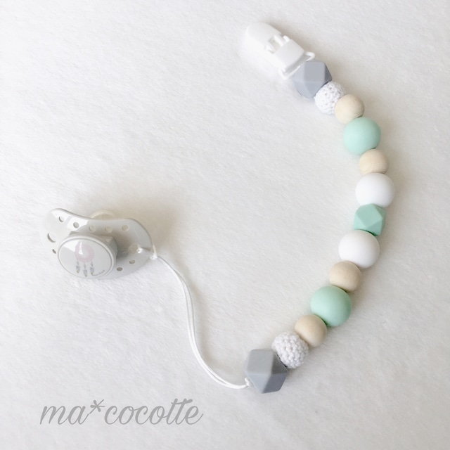 《グレー×グリーンティーシングホルダー》 歯固めに先端の紐をくぐらせて使える 歯固めホルダー☆ こちらのホルダーは、紐を通せる穴が空いている 玩具やおしゃぶりを通して、おもちゃホルダーや おしゃぶりホルダーとしても使えます♡ ※写真のおしゃぶりは付属しません。 ホルダーをご使用になる際は、必ずお子様の スタイやお洋服、ベビーカーやブランケットなど にクリップを挟んだ状態でお使い下さい。 ★歯固めについて ・乳歯の生え始めのムズムズを抑える ・上手に噛む為のトレーニング ・噛むことで歯茎をマッサージし、乳歯の 成長、顎の発達を促すことが期待できる などの効果があります。 ※伸縮性のない紐を使用しています ★素材について シリコンビーズはFDA承認の体に害のない、 BPAフリー、重鉱物フリー、食品グレードの 安全で柔らかいシリコンを使用しています。 木のパーツはオーガニックのメープルウッド で作っていますので、赤ちゃんの口に入っても安全です。 ★お手入れ方法 木製玩具は水気を嫌いますので、濡れた状態 で放置せず、ご使用後は乾いた柔らかい布で拭き取り日陰で乾燥させて下さい。汚れが気になる時は1~3%に薄めた中性洗剤を布に 含ませ固く絞ってから拭いて日陰で乾燥して下さい。シリコンやプラスチック製品は中性洗剤で洗い、水気を拭き取った後自然乾燥して下さい。 ※紐は解けないようにお作りしていますが、万が一外れてしまう事があった場合、アフターサービスとしてご購入から3ヶ月以内に限り、紐の無償交換を承ります。 【注意事項】 必ず大人の方の目の届くところでご使用を お願い致します。 万が一ストラップが外れてしまった場合は、 お子様がビーズを誤飲してしまわない様、 直ちにご使用をおやめ下さい。 ご使用中の事故に関しましては一切責任を 負いかねますのでご了承ください。 画面上での色や明るさは、ご使用の モニターやコンピューター環境によって、 実際の商品と異なると感じる場合がござい ます。 商品についてご不明な点、ご質問などございましたら、お気軽にお問い合わせ下さい。