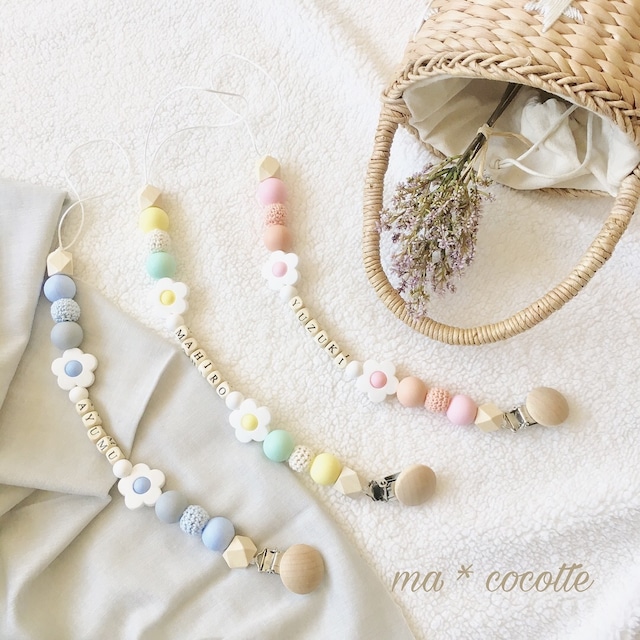 《フラワー名入れティーシングホルダー・おしゃぶりホルダー》 紐を通す穴が空いている歯固めや、おしゃぶりや オモチャ等を先端の紐に通してお使いいただける ホルダーです。 ベビーカーやブランケット、スタイ等に付けて ご使用下さい。 ■カラー ピンクmix イエローmix ブルーmix ※6文字まで追加料金無しで入れられます。 ご購入の際に備考欄に入れたいお名前を アルファベットでご記載下さい。 7文字以上は1文字につき+50円です。 その場合は専用ページをお作りしますので こちらのページの商品をご購入せずに、 ショップのお問い合わせからご連絡下さい。 ❁こちらはホルダーのみの販売ページです。 是非別売りの歯固めパーツ(単品)と組み合わせて ご購入下さい♥ ★歯固めについて ・乳歯の生え始めのムズムズを抑える ・上手に噛む為のトレーニング ・噛むことで歯茎をマッサージし、乳歯の 成長、顎の発達を促すことが期待できる などの効果があります。 ※伸縮性のない紐を使用しています ★素材について シリコンビーズはFDA承認の体に害のない、 BPAフリー、重鉱物フリー、食品グレードの 安全で柔らかいシリコンを使用しています。 木のパーツはオーガニックのメープルウッド で作っていますので、赤ちゃんの口に入っても安全です。 ★お手入れ方法 木製パーツが付いた歯固めはきつく絞った タオルや、赤ちゃん用お口ふき等で表面の 汚れを拭き取り、しっかりと乾燥(日陰干し) して下さい。 取り外し可能なシリコンパーツは 水洗い可能です。汚れが気になる時は食器用 中性洗剤で洗い、水で洗い流してタオル等で 水気を拭き取り自然乾燥させて下さい。 【注意事項】 必ず大人の方の目の届くところでご使用を お願い致します。 万が一ストラップが外れてしまった場合は、 お子様がビーズを誤飲してしまわない様、 直ちにご使用をおやめ下さい。 ご使用中の事故に関しましては一切責任を 負いかねますのでご了承ください。 画面上での色や明るさは、ご使用の モニターやコンピューター環境によって、 実際の商品と異なると感じる場合がござい ます。 商品についてご不明な点、ご質問などございましたら、お気軽にお問い合わせ下さい。